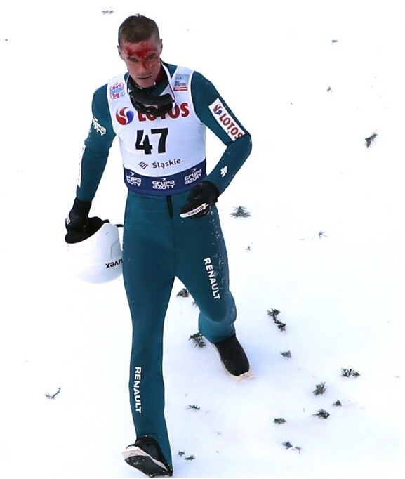 Na zdjęciach widać, że Żyła przy upadku rozciął sobie czoło.