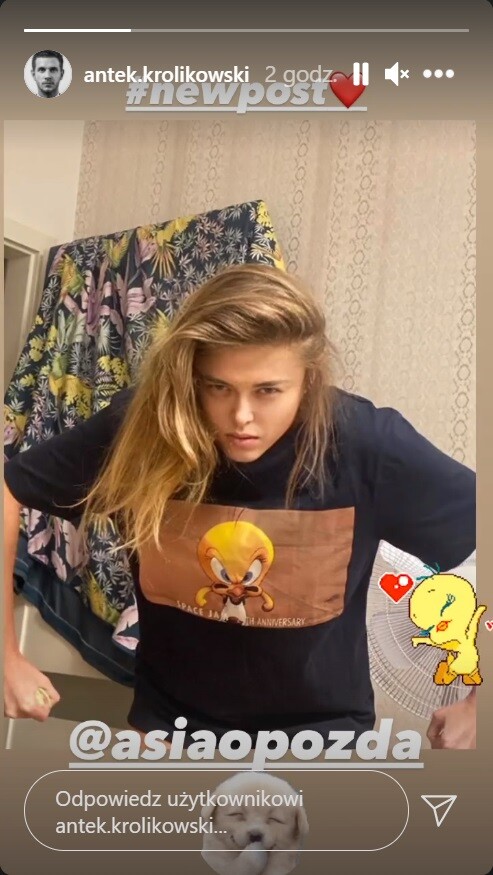 Antoni Królikowski i Joanna Opozda ostatnio skupili się na zawodowych obowiązkach i nie publikowali w sieci wspólnych zdjęć. Teraz aktor zaskoczył fanów, którzy zastanawiali się, jak wiedzie im się po ślubie. Królikowski udostępnił w sieci fotografię przedstawiającą jego żonę w naturalnej odsłonie. Joanna, bez makijażu i w luźnym stroju, odtwarza pozę, jaką przybrał na jej koszulce kreskówkowy kanarek Tweety.