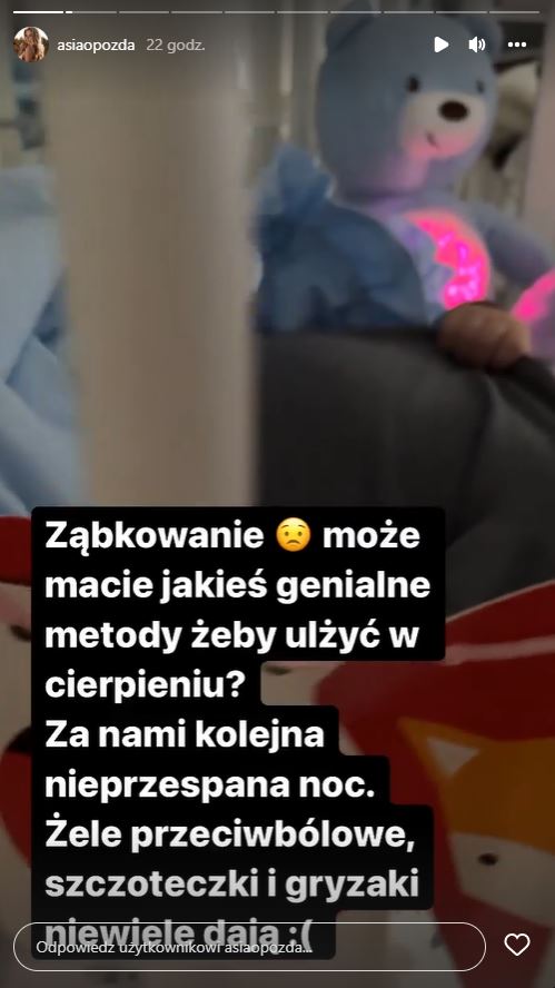 34-latka w ostatnich dniach nie mogła spać spokojnie. Wszystko z uwagi na to, że u małego Vincenta rozpoczęło się bolesne ząbkowanie. Joanna Opozda próbowała wszelkich metod, aby uśmierzyć ból u swojego dziecka. Gdy wszystkie wypróbowane sposoby okazały się nieskuteczne, aktorka zwróciła się o pomoc do swoich fanów za pośrednictwem instagramowej relacji: