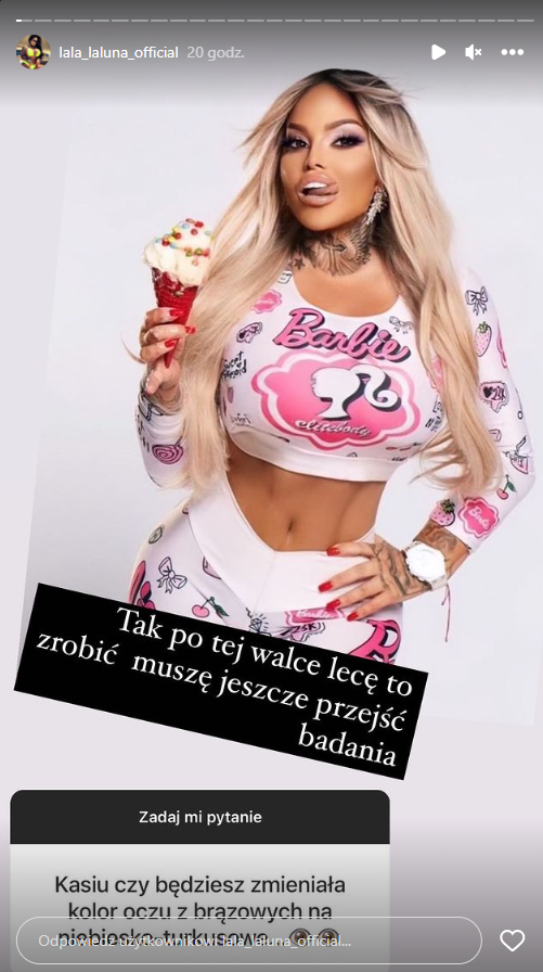 Na Instagramie Laluna zdradziła, że wie już, kiedy zrobi sobie operację, jednak wcześniej musi przejść jeszcze określone badania. Kobieta pokazała również, na jakim efekcie jej zależy – brązowy kolor oczu chce zmienić na coś pomiędzy odcieniem island blue a eceland gray.