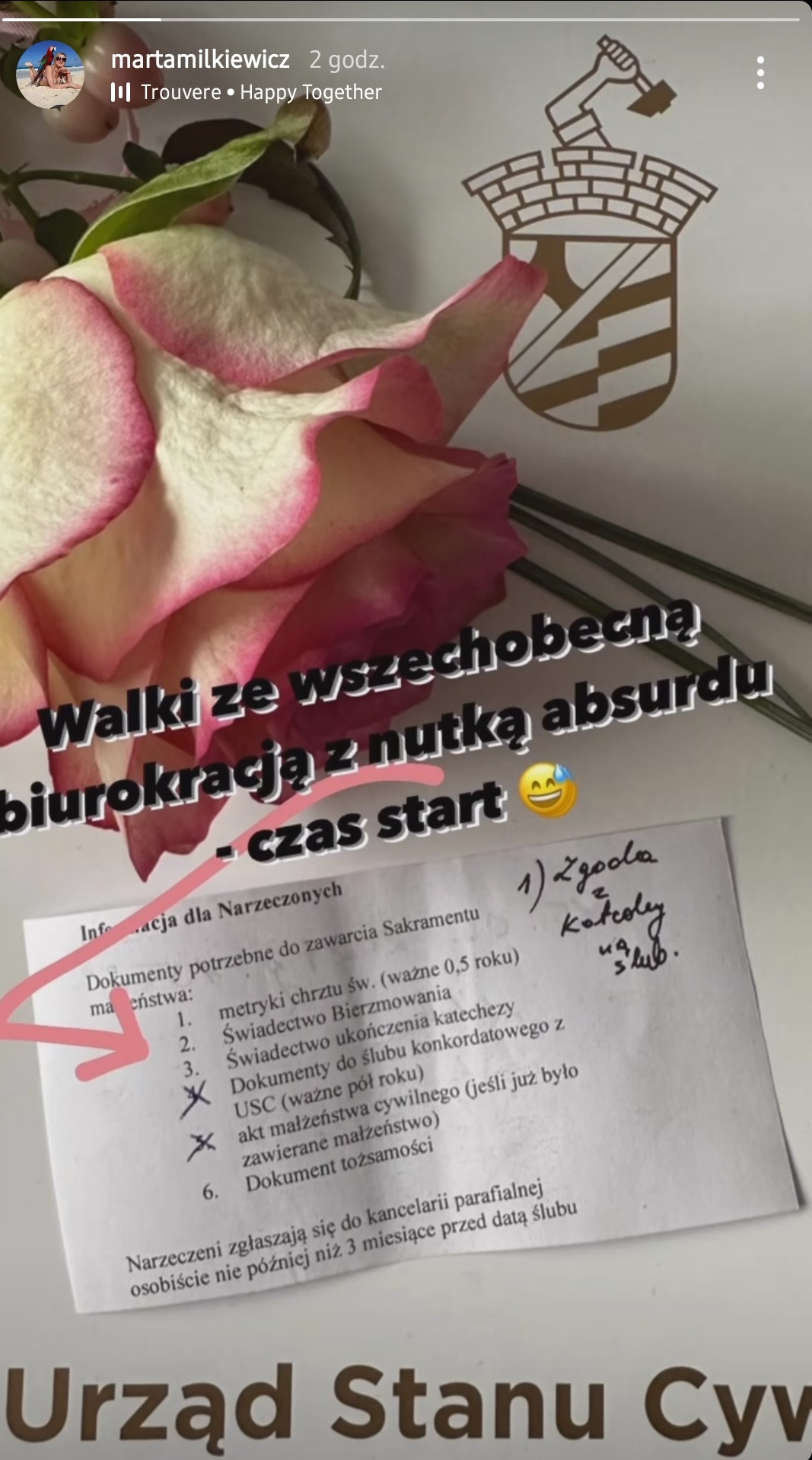 Okładkę z Urzędu Stanu Cywilnego i kartkę ze spisem dokumentów potrzebne do zawarcia Sakramentu małżeństwa. Zatem wszystko wskazuje na to, że uczestniczka eksperymentu jest szczęśliwie zakochana i planuje zalegalizować swój związek nie tylko w urzędzie, ale również w kościele. Do publikacji dodała krótki komentarz: