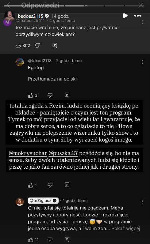 Do krytycznych wpisów odniósł się także raper Bedoes, który miał okazję był gościem specjalnym w drugim epizodzie. Prywatnie jest on wieloletnim przyjacielem piłkarza. Na Instagramie zapewnił, że Tymek to człowiek z dobrym sercem, który po prostu bierze udział w programie o takiej formule, a nie innej.