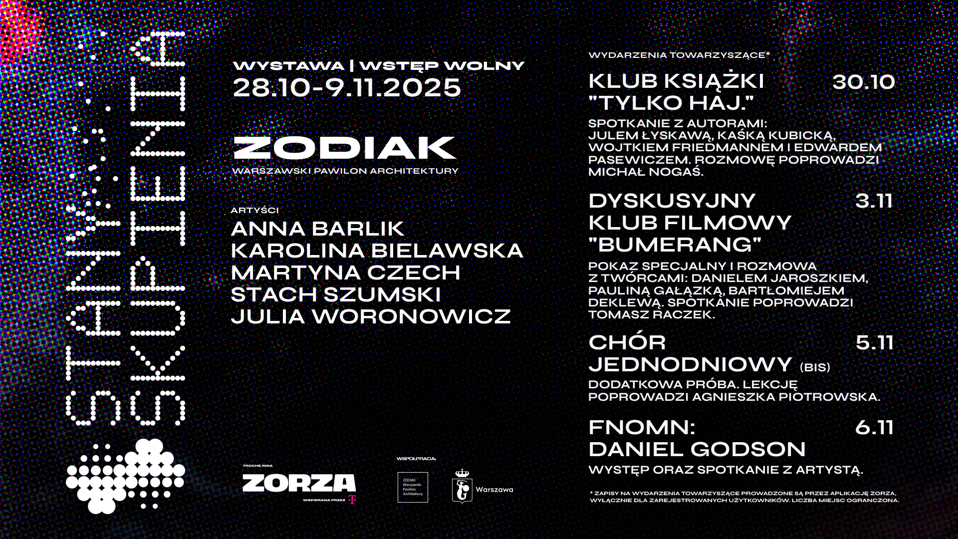 Oprócz wystawy, w ZODIAKU odbędzie się cykl spotkań, koncertów i warsztatów. Tak jak podczas festiwalu, udział w nich będzie możliwy wyłącznie osób posiadających bilety oraz karnety zarejestrowane w aplikacji ZORZA – liczba miejsc jest ograniczona, a przy rejestracji obowiązuje kolejność zgłoszeń.