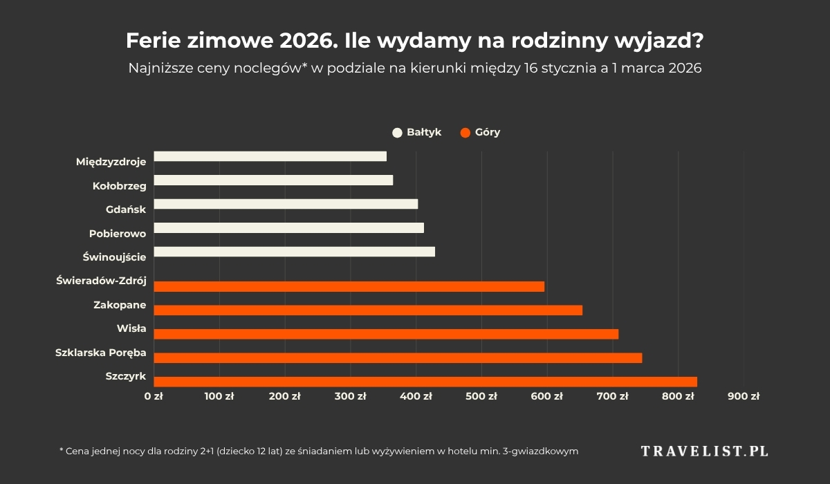 Analiza została przygotowana na podstawie ofert dostępnych w portalu rezerwacyjnym Travelist.pl w dniu 22 października. Uwzględniono różne terminy pobytów w okresie od 16 stycznia do 1 marca 2026 roku (przy wyborze 5 nocy). Podane ceny za noc dotyczą pobytu ze śniadaniem lub dwoma posiłkami dla rodziny 2+1 (dziecko 12 lat).